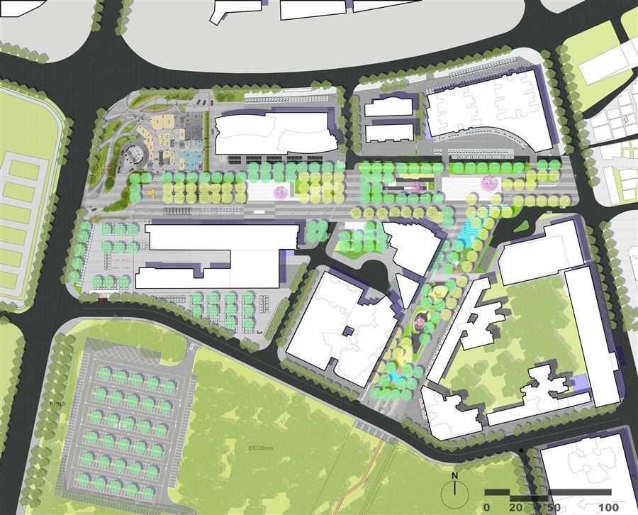 AUBE 欧博设计通过重点打造两条全新景观轴线,缝合、激活片区公共空间。自然活力轴创造生态自然街区,营造复合性功能场所,吸引人气,创造活力。设计通过保留现状长势良好的树木,在林下增加休憩活动空间,在硬质区域增加特色开花乔木和雨水花园,融入绿色生态理念和海绵城市生态功能,聚集人气、提升街区价值和活力。
