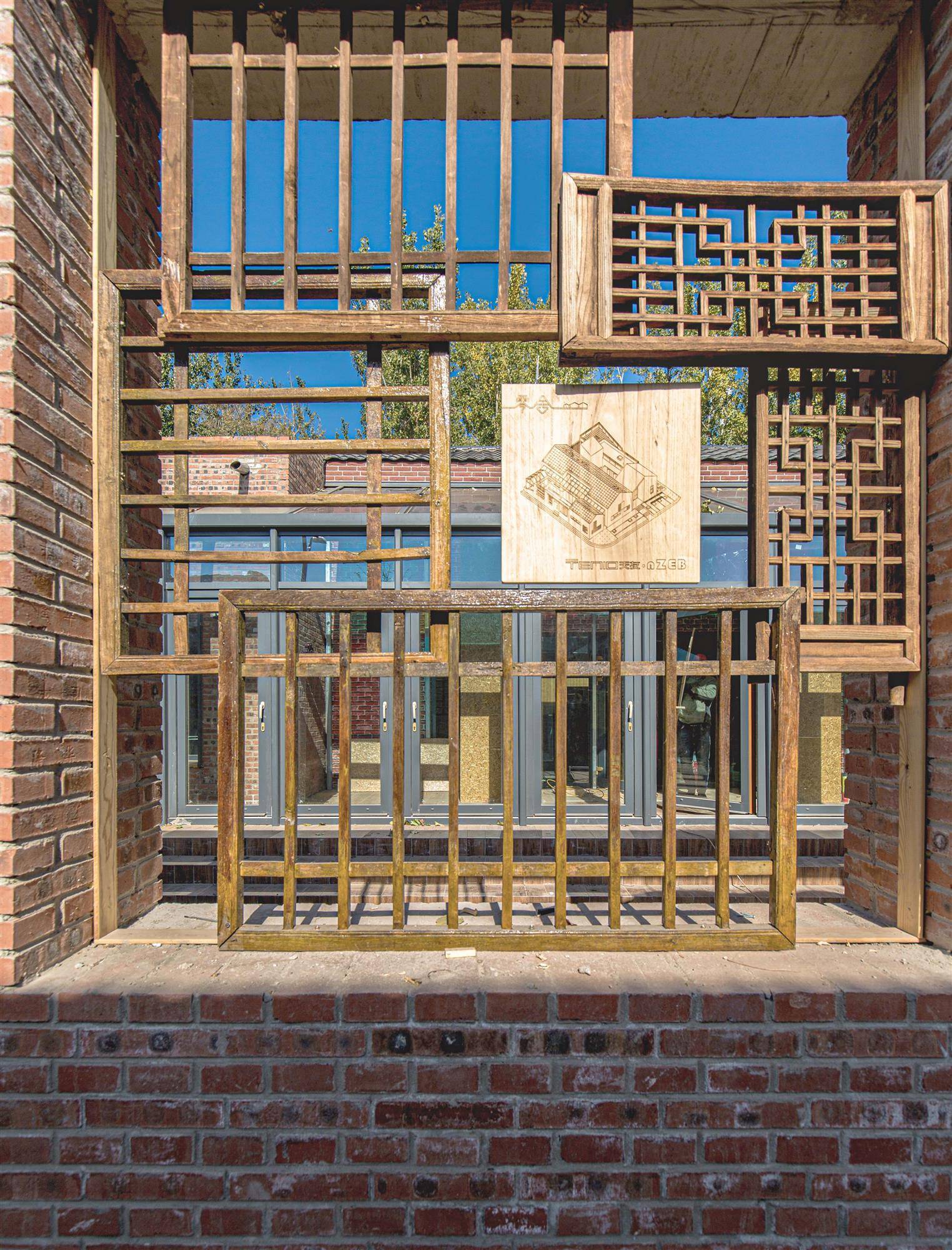 围墙上用拆除的旧窗做出了LOGO